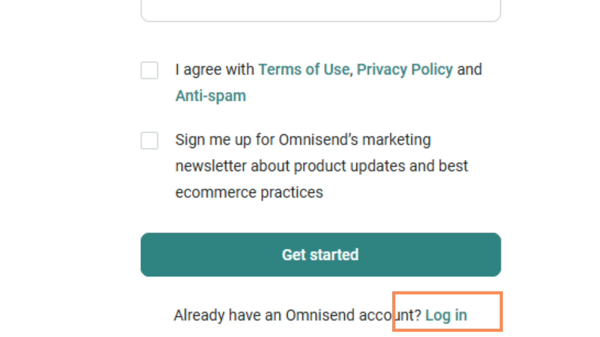 3. Once installed, you’d be brought to the registration page for Omnisend. Scroll down all the way & log in with your Omnisend account.