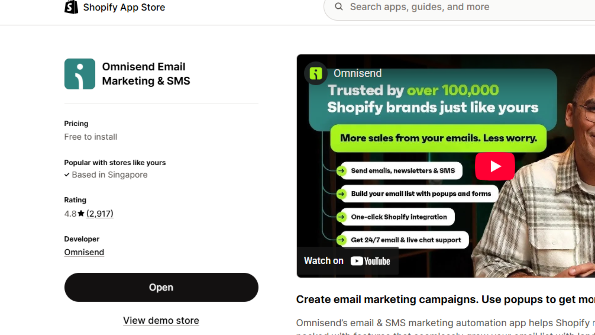 4. Omnisend will handle the back-end work, after which you will be brough to the app store page again. Click “Open” here!
