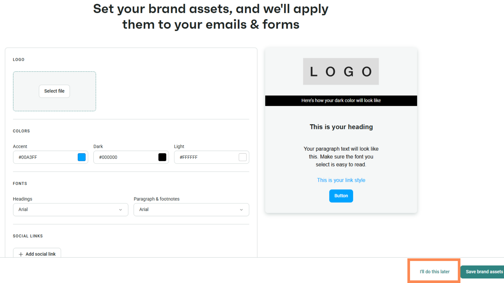 5. Once you’ve clicked “Open” you’ll be given the option to set your brand assets – let’s skip this for now & proceed to “I’ll do this later”.