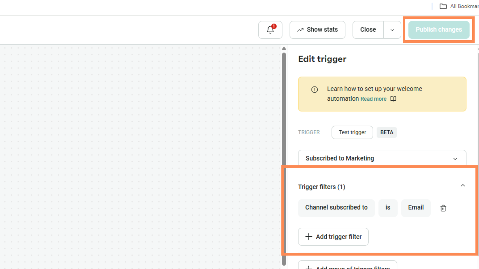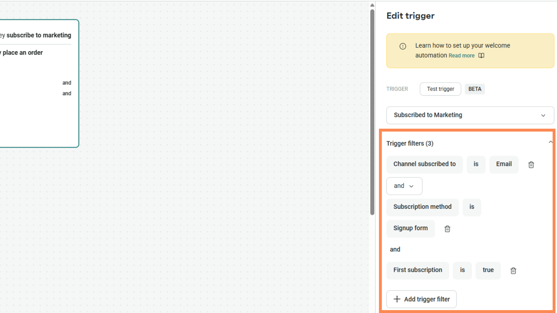 8. The workflow is ready but we recommend to remove the “Subscription method is Sign-up form” & “First subscription is True” for making it easy to go from end to end first.